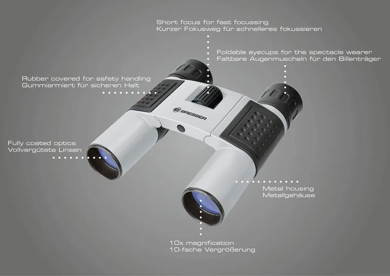 Met 190 gram is de verrekijker zeer licht in gewicht. De body heeft een rubberen bekleding. Zo heb je meer grip en ligt de verrekijker comfortabel in de hand. Het model is gemakkelijk op te vouwen, zodat je de Bresser Topas 10×25 overal mee naartoe kunt nemen.