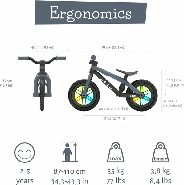 De Chillafish BMXie 2 loopfiets is ideaal voor kinderen tussen de 2 en 5 jaar met een lengte tussen de 85 en 110 cm. Het frame is gemaakt van lichtgewicht staal en verhard plastic waardoor deze robuuste loopfiets 3,8 kg weegt. De loopfiets groeit met de kids mee door het verstelbare zadel van 32 tot 41 cm. Door de 12 inch (diameter van 30 cm) EVA+ rubberen banden is er meer balans en stabiliteit. Ook raken de massieve schuim banden nooit lek. Ideaal voor off-road avonturen!