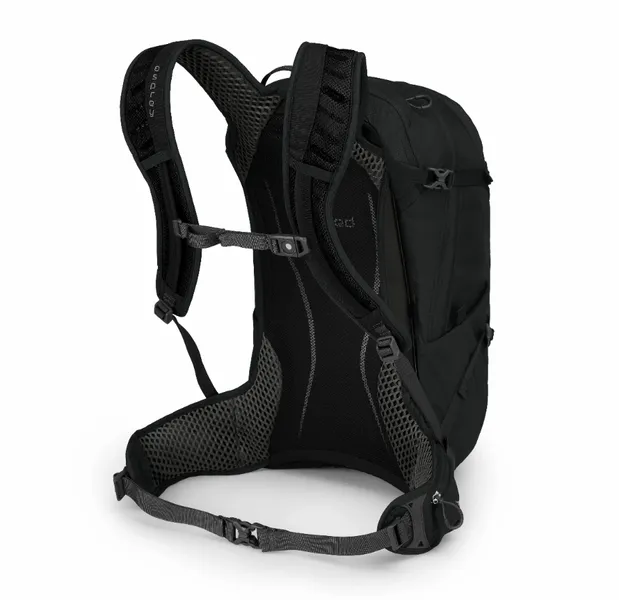 De voorkant van deze Osprey rugzak kun je openritsen. Hier vind je een organizer voor alle belangrijke kleine spullen waar je snel bij wilt zijn. Denk aan je telefoon, zonnebrand en kleingeld. Daarnaast vind je in het midden op de voorkant een stretchvak waar je nog wat extraโs opbergt dat er niet snel uitvalt. Bijvoorbeeld een extra shirt of regenjas. Ook vind je een krasvrij vakje aan de bovenkant van de rugzak voor bijvoorbeeld je zonnebril. Aan de zijkant vind je 2 stretch mesh vakken voor drinkflessen. Tot slot heb je aan de binnenkant een vak voor een waterzak, zo blijf je goed gehydrateerd tijdens een uitdagende wandeling of fietstocht.