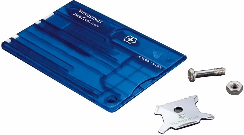 De Victorinox SwissCard Quattro is een handige multitool in de vorm van een creditkaart. Dit heeft als grote voordeel dat de multitool gemakkelijk in je broekzak past en je de SwissCard eenvoudig overal mee naartoe neemt. De Victorinox SwissCard Quattro is voorzien van 12 verschillende functies voor dagelijks gebruik en onder andere uitgevoerd met een mes, verschillende schroevendraaiers, ballpoint pen en liniaal. De buitenkant van de SwissCard is gemaakt van transparant en lichtgewicht plastic.